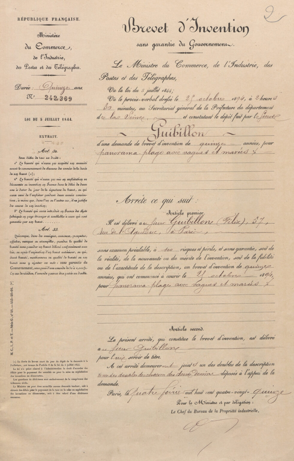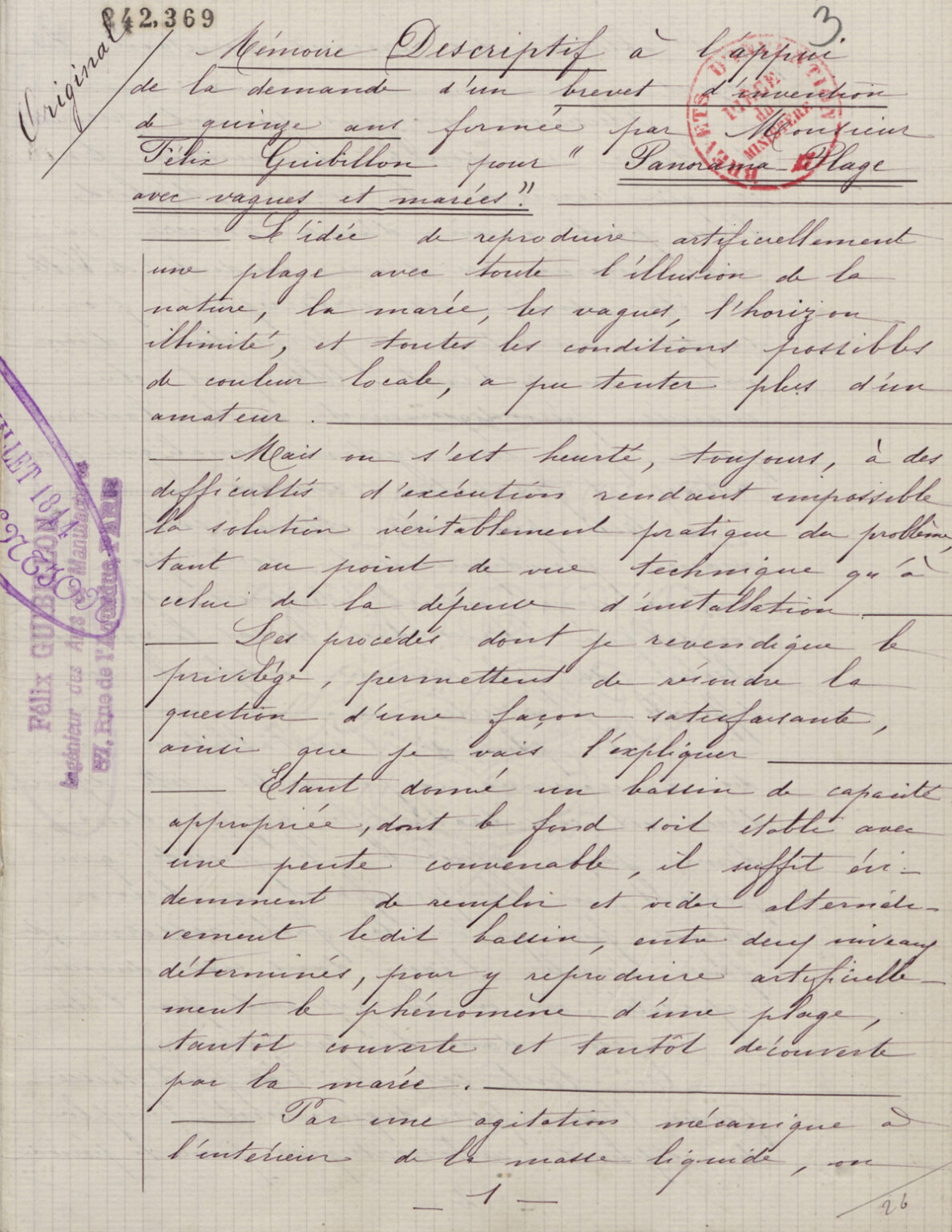 Breveté en 1846 par l’employé Desprez, le Panorama Plage ambitionne d’apporter les bords de mer dans les théâtres. Il ne sera pas appliqué tel quel mais il fait écho aux expériences d’eaux théâtralisées des années 1830-1900, comme le Théâtre nautique, qui ouvre (et referme) ses portes en 1834.